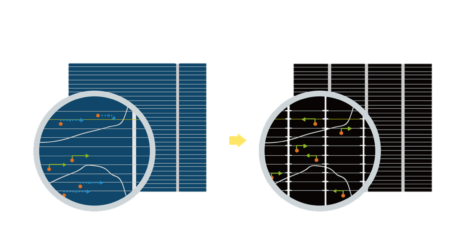 • 結合半切電池,降低遮陰影響、提升模組抗隱裂能力、並減少電阻損耗,進一步提升模組發電效能。